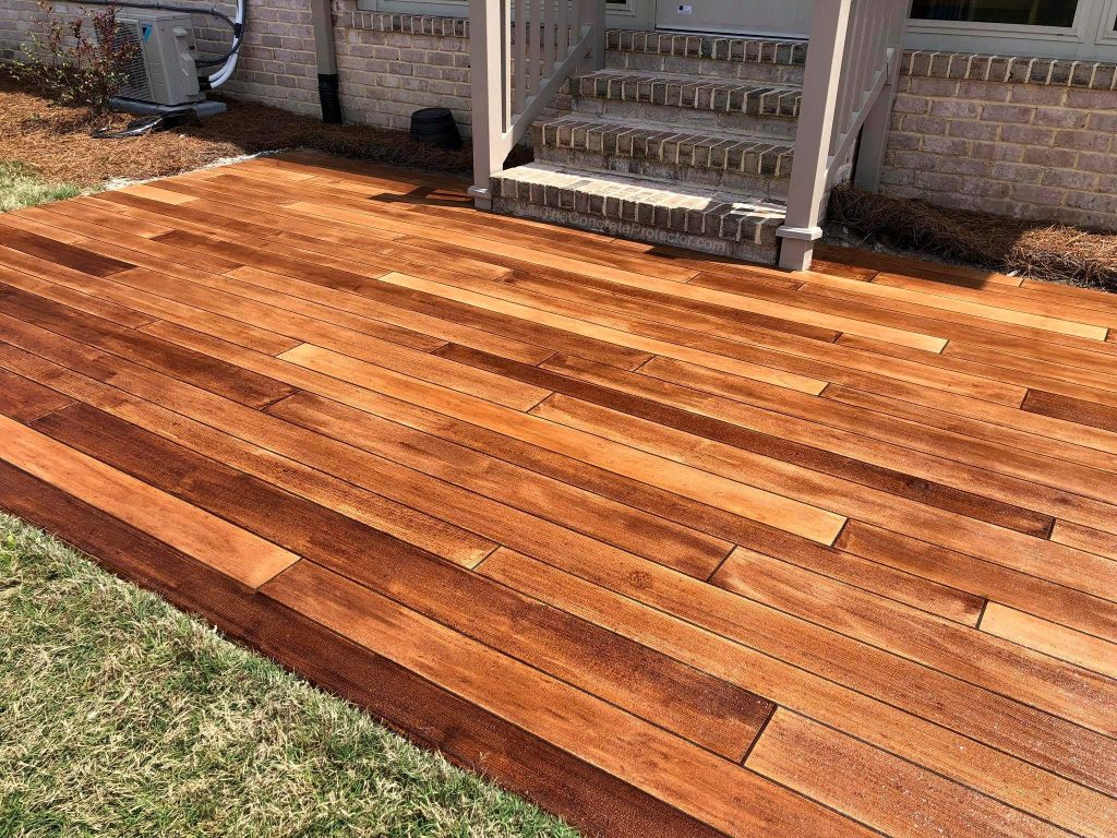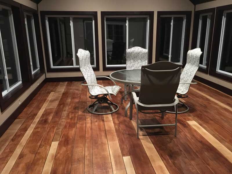 Imagine your existing concrete surface transformed to look like hardwood flooring. Our Rustic Decorative Concrete Wood resurfacing finish can make this a reality for your concrete floors! This system is extraordinarily popular and for good reason! Whether interior or exterior, on whatever existing concrete surface you have, this faux wood system option beats out other flooring options hands down.